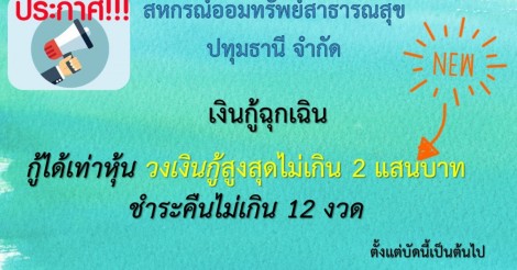 เงินกู้ฉุกเฉินกู้ได้เท่าหุ้น ไม่เกิน 2 แสนบาท ชำระคืนไม่เกิน 12 งวด