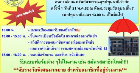 ขอเชิญร่วมโครงการสหกรณ์สัญจร ครั้งที่ 1 วันที่ 21 พฤษภาคม 2562 (รพ.ปทุมธานี)