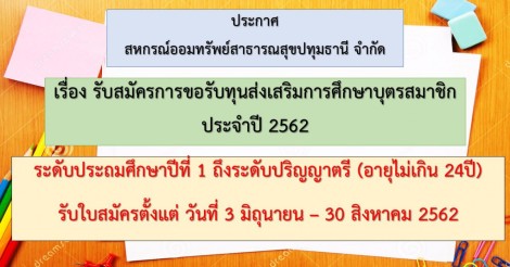 ประกาศ เรื่องรับสมัครการขอรับทุนส่งเสริมการศึกษาบุตรสมาชิก ประจำปี 2562