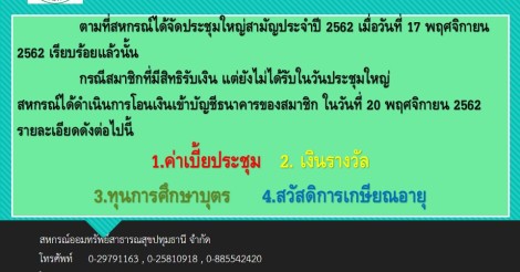 สหกรณ์ดำเนินการโอนเงิน ค่าเบี้ยประชุม เงินรางวัล ทุนการศึกษาบุตร และสวัสดิการเกษียณอายุ เข้าบัญชีธนาคารของสมาชิก ในวันที่ 20 พฤศจิกายน 2562