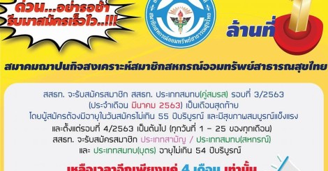 สสธท. (ล้านที่1) เปิดรับสมัครสมาชิก ประเภท สมทบ (คู่สมรส) เดือนมีนาคม 2563 เป็นเดือนสุดท้าย