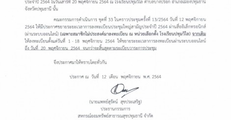 ประกาศ ขยายระยะเวลาการลงทะเบียนประชุมใหญ่สามัญประจำปี 2564 ผ่านสื่ออิเล็กทรอนิกส์