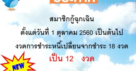 เรียนสมาชิกสหกรณ์ทุกท่านโปรดทราบ สมาชิกท่านใด กู้ฉุกเฉินตั้งแต่วันที่ 1 ตุลาคม 2560 เป็นต้นไป งวดในการผ่อนชำระเปลี่ยนจาก 18 งวด เป็น 12 งวด