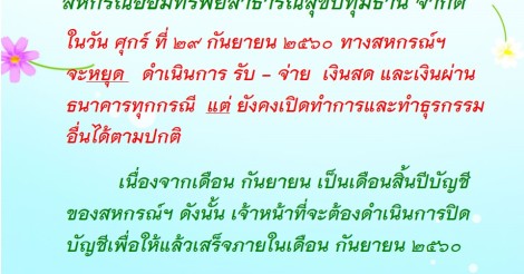 วัน ศุกร์ ที่ 29 กันยายน 2560 สหกรณ์ฯจะหยุด ดำเนินการ รับ - จ่าย เงินสด และเงินผ่านธนาคารทุกกรณี แต่ ยังคงเปิดทำการและทำธุรกรรมตามปกติ