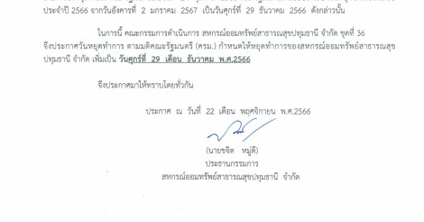 ประกาศ วันหยุดทำการสหกรณ์ ในวันที่ 29 ธันวาคม 2566