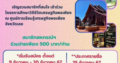 ประชาสัมพันธ์ การรับสมัครร่วมโครงการวิถึชีวิตเศรษฐกิจพอเพียง ปี 2568 วันที่ 23 - 26 มกราคม 2568 สมัครได้วันที่ 9 - 20 ธันวาคม 2567