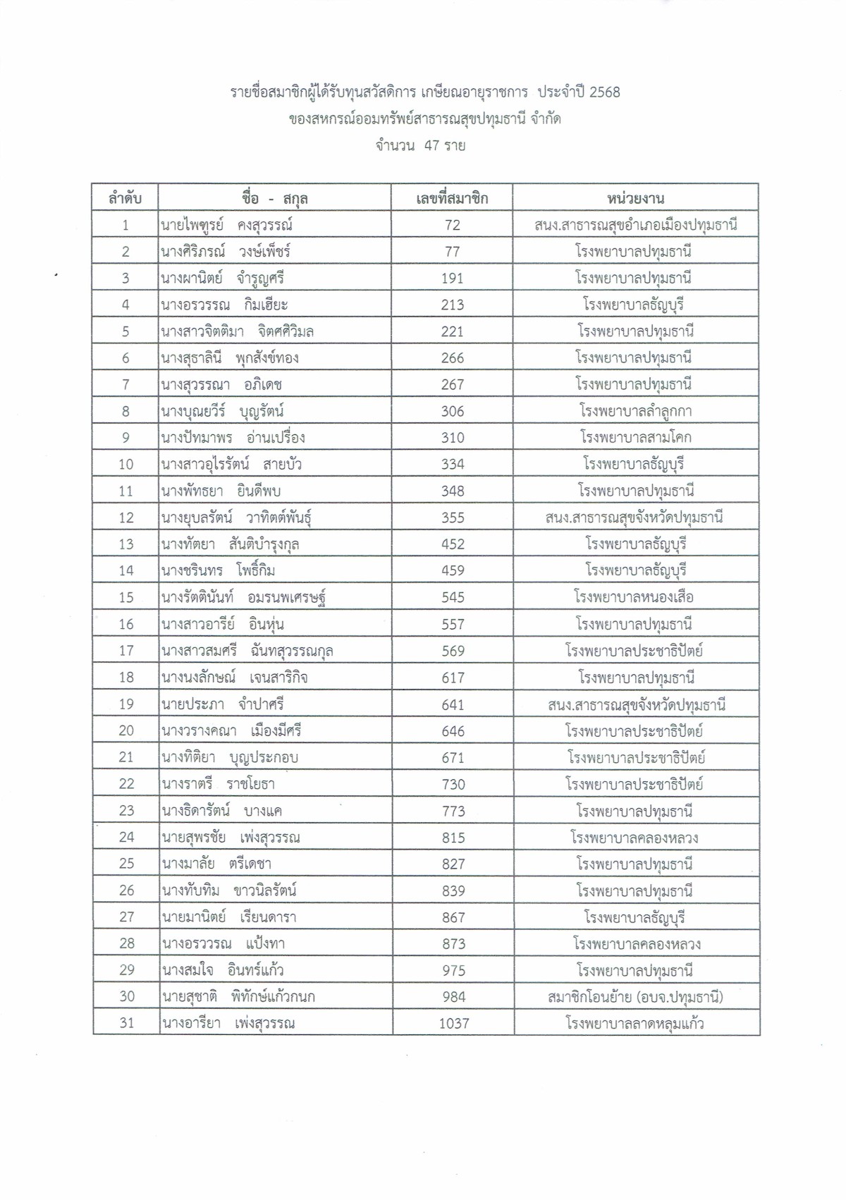 ประกาศ รายชื่อผู้ได้รับทุนสวัสดิการเกษียณอายุราชการประจำปี 2568