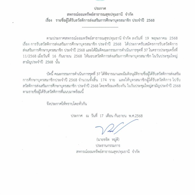 ประกาศ รายชื่อผู้ได้รับสวัสดิการส่งเสริมการศึกษาบุตรสมาชิก ประจำปี 2568