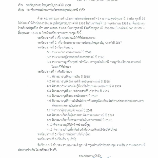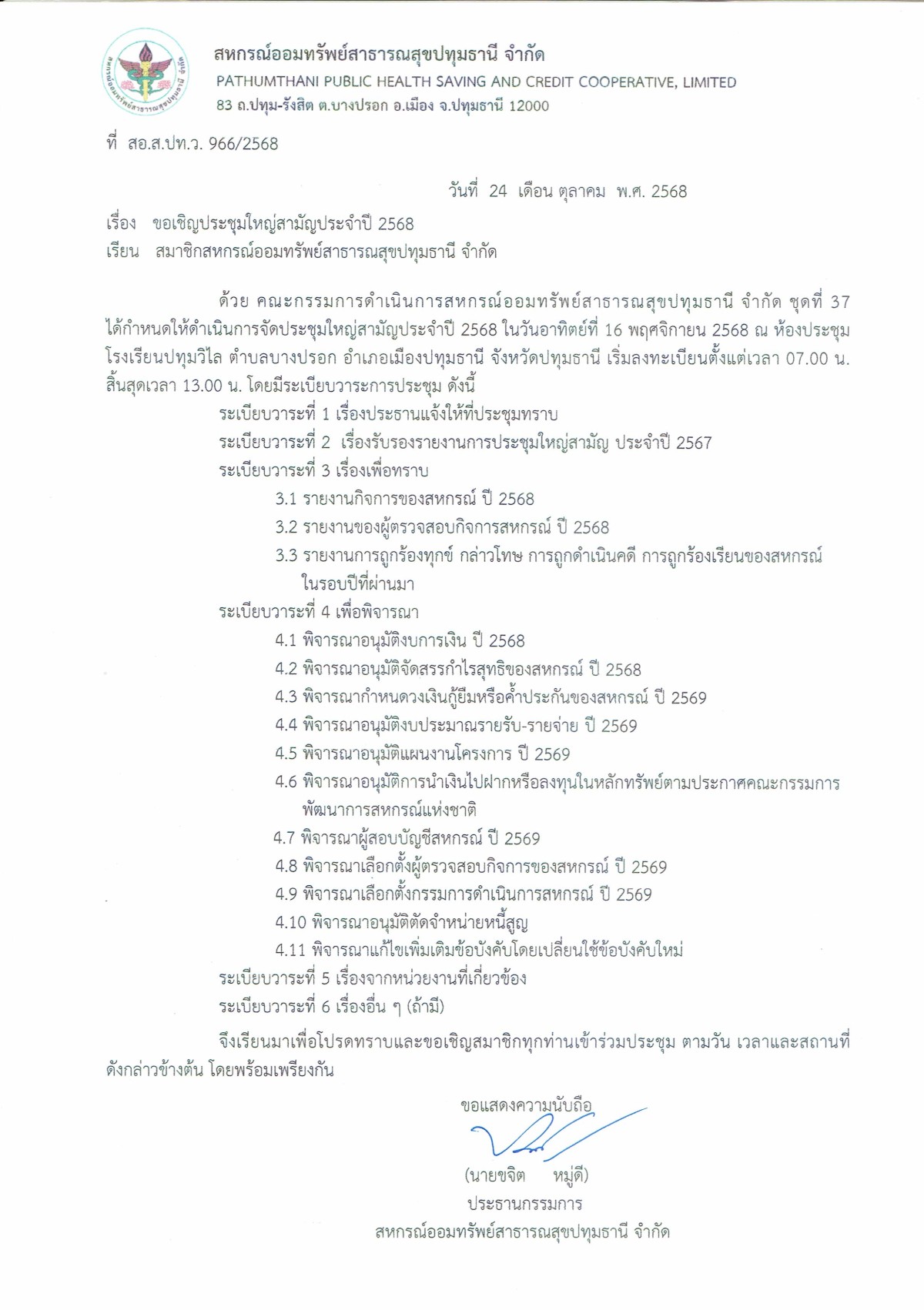 เรียนเชิญประชุมใหญ่สามัญประจำปี 2568 ในวันอาทิตย์ที่ 16 พฤศจิกายน 2568 ณ ห้องประชุม โรงเรียนปทุมวิไล