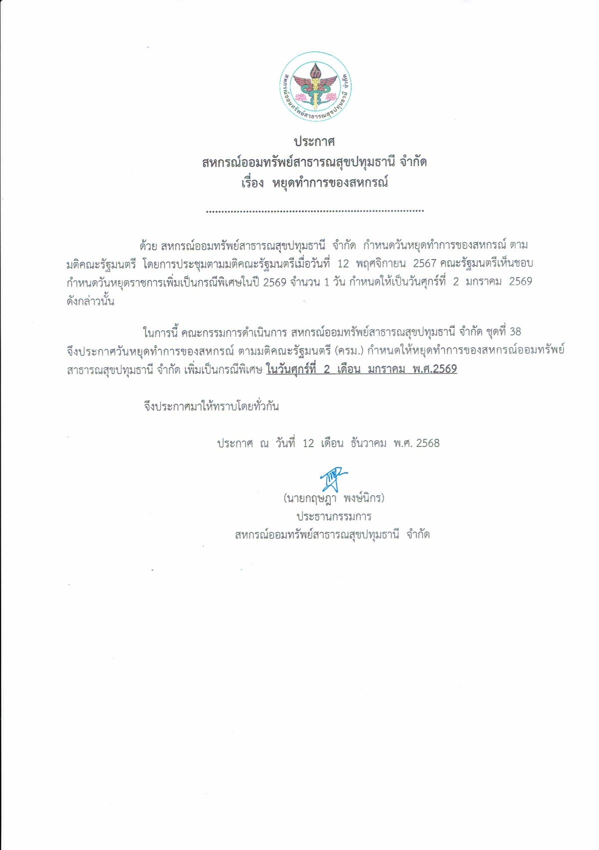 ประกาศ วันหยุดทำการของสหกรณ์ฯ เพิ่มเป็นกรณีพิเศษ วันที่ 2 มกราคม 2569