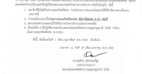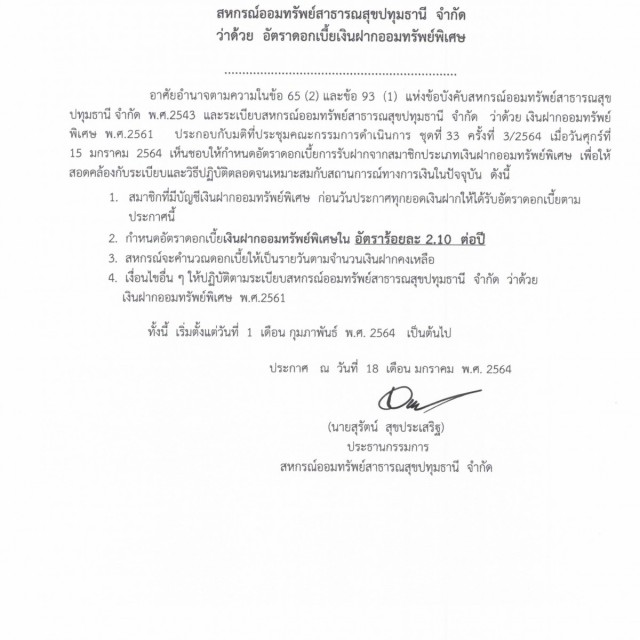 ประกาศ อัตราดอกเบี้ยเงินฝากออมทรัพย์พิเศษ