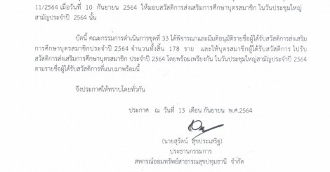 ประกาศ รายชื่อผู้ได้รับสวัสดิการส่งเสริมการศึกษาบุตรสมาชิก ประจำปี 2564 (เงินโอนเข้าบัญชี วันที่ 20 พฤศจิกายน 2564)
