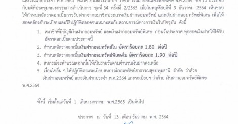 ประกาศ อัตราดอกเบี้ยเงินฝากออมทรัพย์ และเงินฝากออมทรัพย์พิเศษ