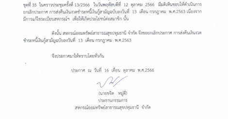ประกาศ ขอยกเลิกประกาศ การส่งคืนเงินงวดชำระหนี้เงินกู้สามัญ ฉบับลงวันที่ 13 กรกฎาคม 2563