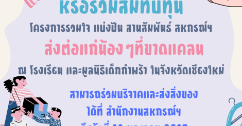 ประชาสัมพันธ์ ขอเชิญร่วมบริจาคสิ่งของ หรือร่วมสมทบทุน โครงการ รวมใจ แบ่งปัน สานสัมพันธ์ สหกรณ์ฯ เพื่อส่งต่อให้น้องๆ ที่ขาดแคลน ใน จ.เชียงใหม่