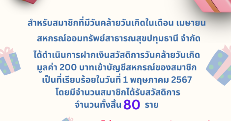 ประชาสัมพันธ์ การจ่ายสวัสดิการวันคล้ายวันเกิดสมาชิกเดือน เมษายน เข้าบัญชีเงินฝากสมาชิกที่เปิดไว้กับสหกรณ์ฯ