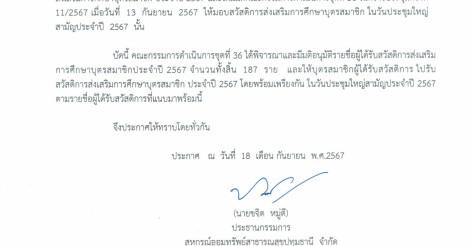 ประกาศ รายชื่อผู้ได้รับสวัสดิการส่งเสริมการศึกษาบุตรสมาชิกประจำปี 2567
