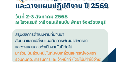 ประชาสัมพันธ์ โครงการ สรุปผลการปฏิบัติงานปี 2568 และวางแผนการปฏิบัติงานปี 2569 วันที่ 2 - 3 สิงหาคม 2568 ณ จังหวัดชลบุรี