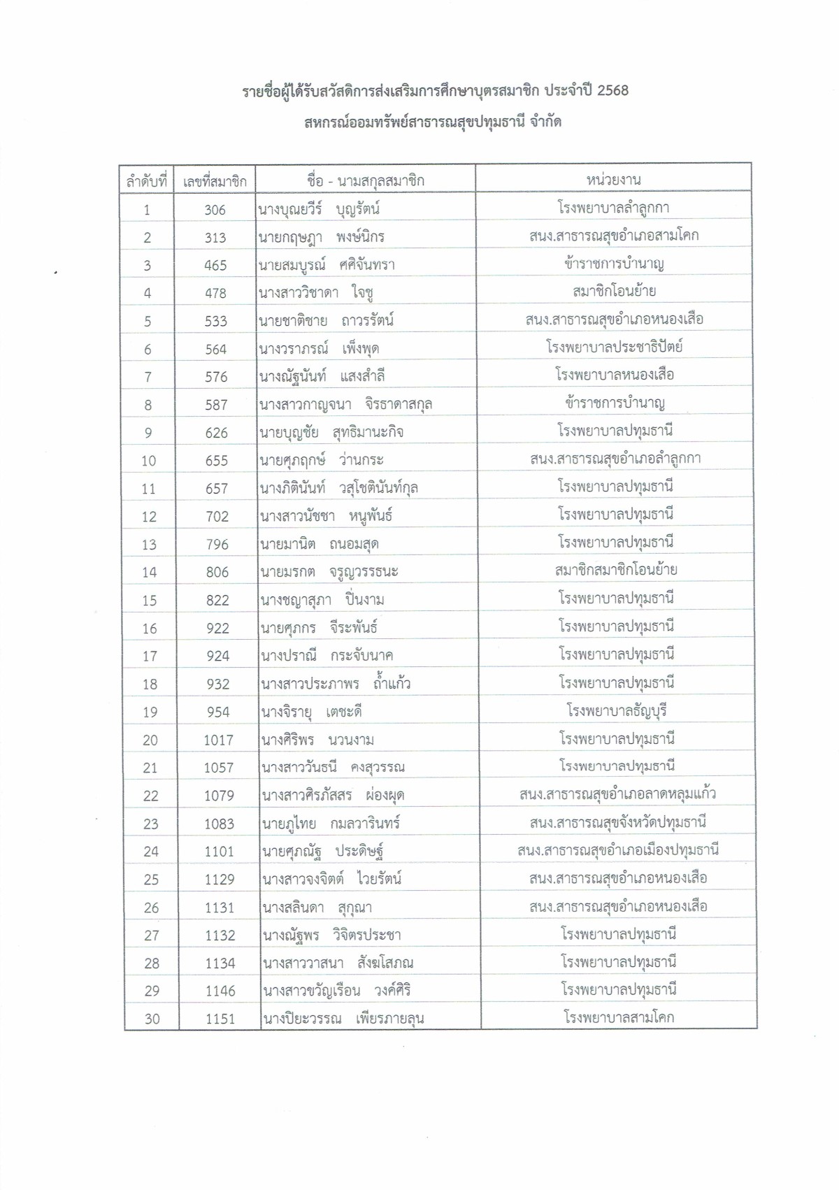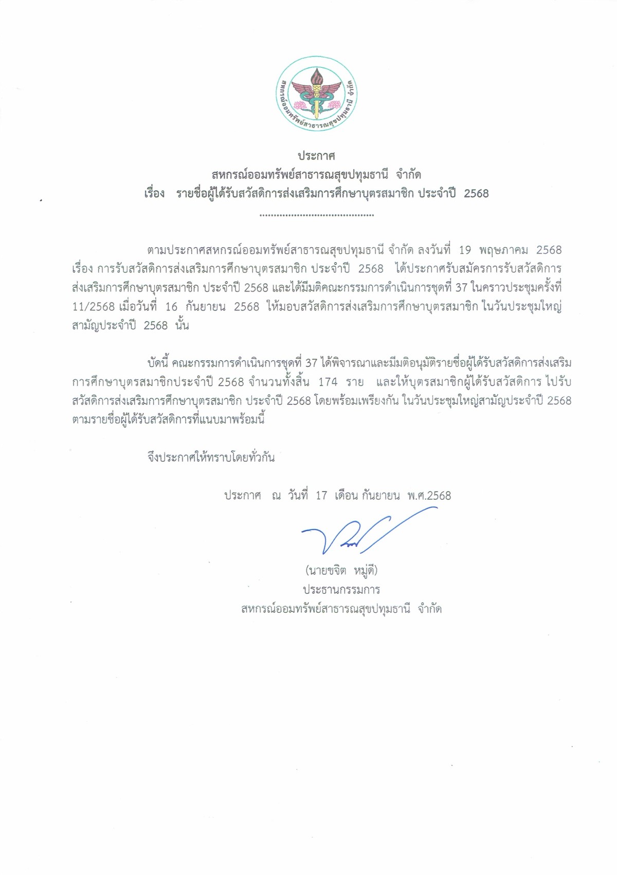 ประกาศ รายชื่อผู้ได้รับสวัสดิการส่งเสริมการศึกษาบุตรสมาชิก ประจำปี 2568