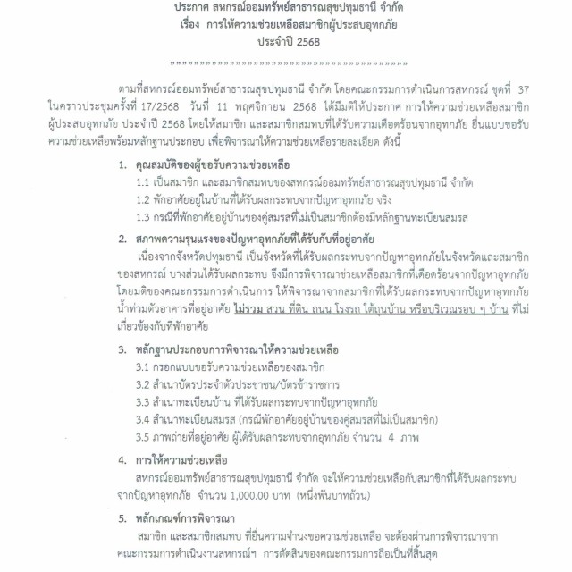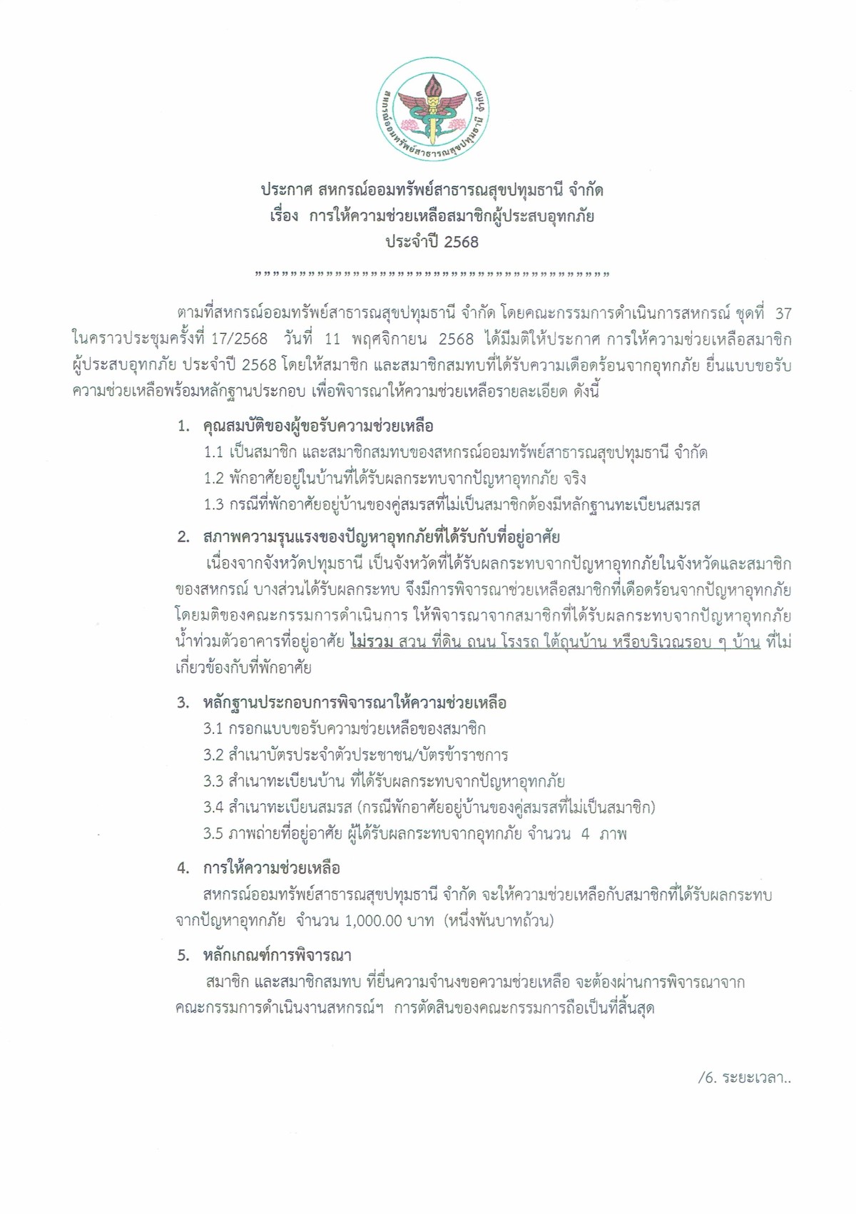 ประกาศ การให้ความช่วยเหลือสมาชิกผู้ประสบอุทกภัย ประจำปี 2568