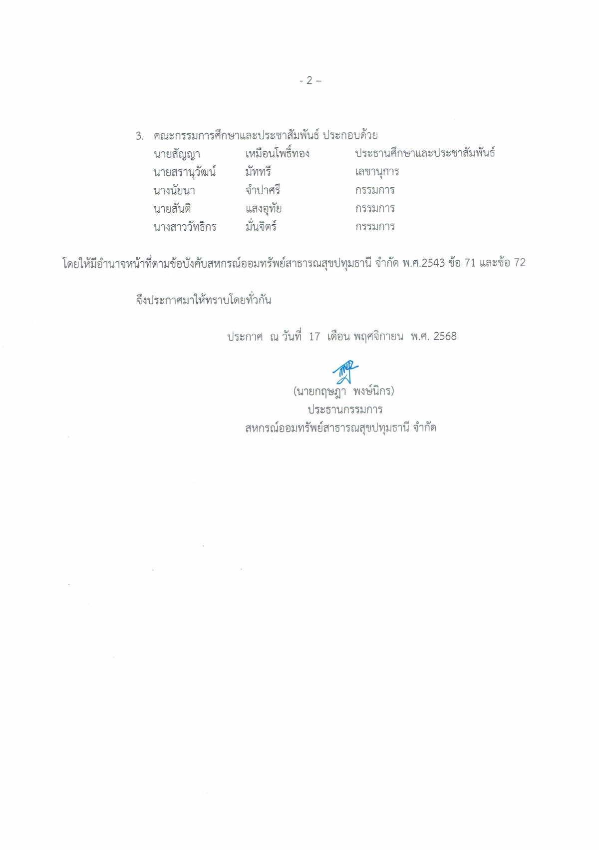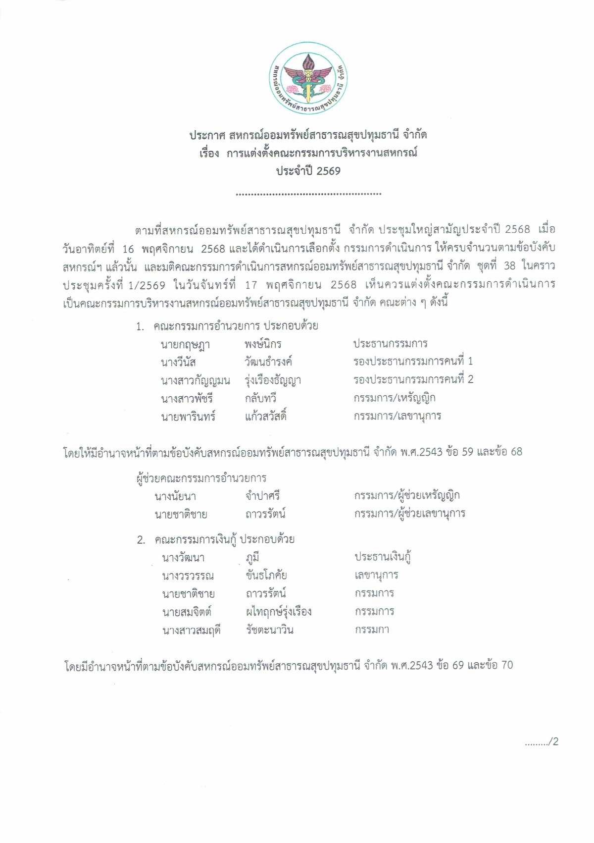 ประกาศ การแต่งตั้งคณะกรรมการบริหารงานสหกรณ์ประจำปี 2569