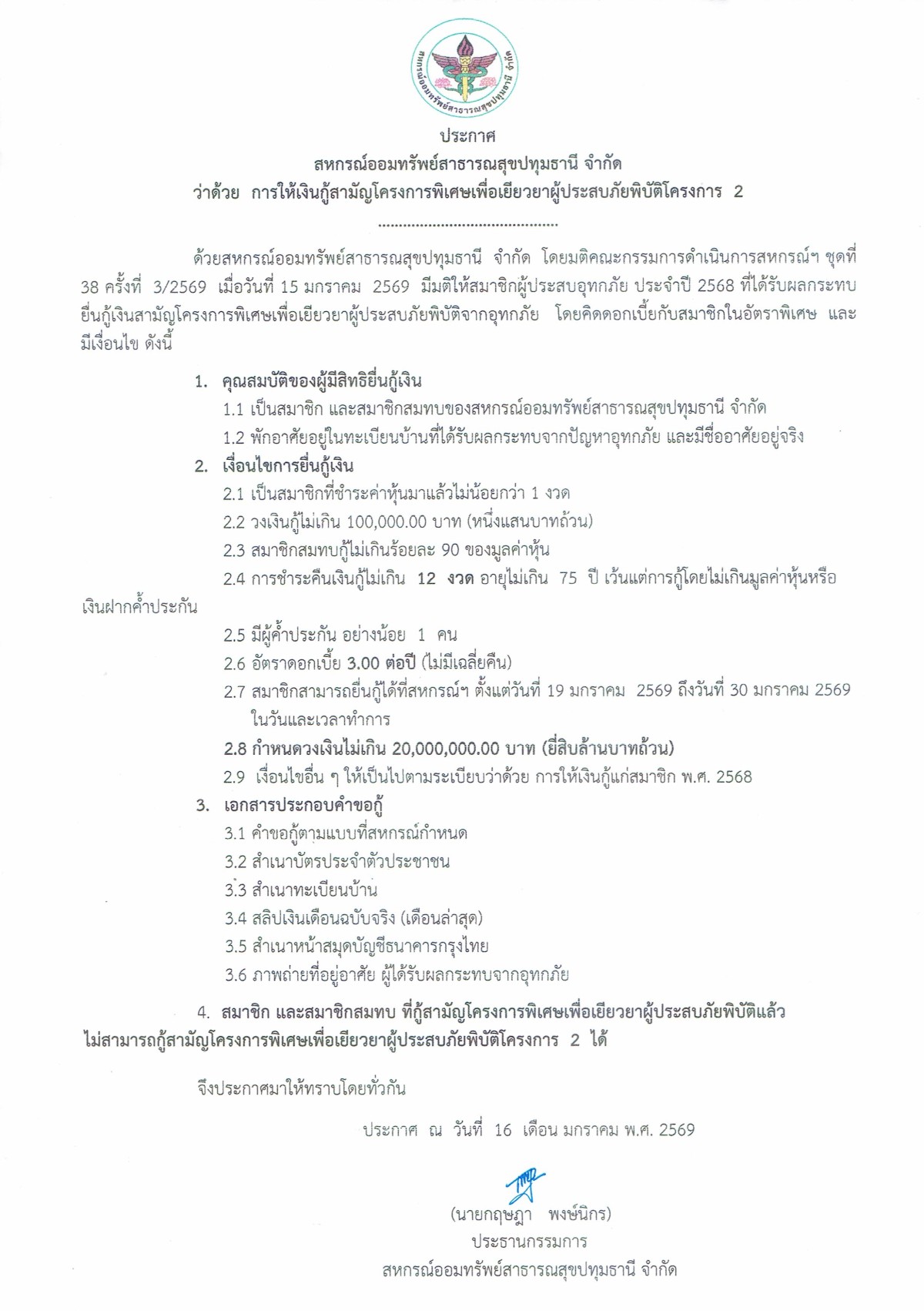 ประกาศ การให้เงินกู้สามัญโครงการพิเศษเพื่อเยียวยาผู้ประสบภัยพิบัติโครงการ 2