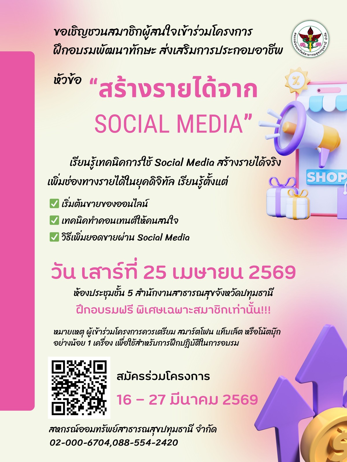 โครงการ ฝึกอบรมพัฒนาทักษะ ส่งเสริมการประกอบอาชีพ หัวข้อ "สร้างรายได้จาก SOCIAL MEDIA" วันที่ 25 เมษายน 2569