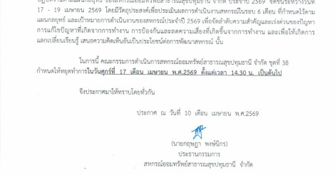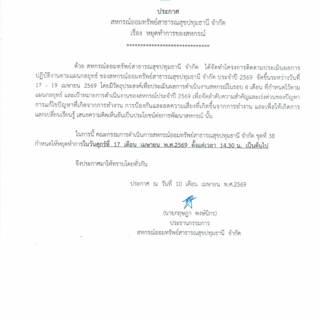 ประกาศ หยุดทำการของสหกรณ์ วันที่ 17 เมษายน 2569 เวลา 14.30 น. เป็นต้นไป