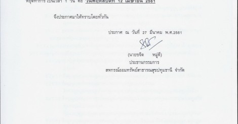 ประกาศ เรื่อง หยุดทำการของสหกรณ์ วันที่ 12 เมษายน 2561
