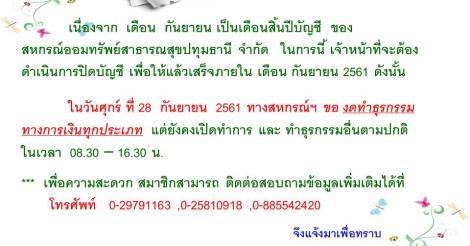 เรียนสมาชิกสหกรณ์ วันศุกร์ที่ 28 กันยายน 2561 สหกรณ์ของดทำธุรกรรมทางการเงินทุกประเภท แต่ยังคงเปิดบริการ และทำธุรกรรมอื่นปกติ